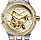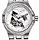 White skeleton dial accented blue hands