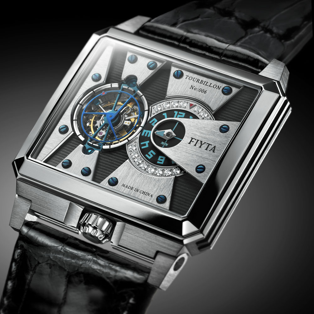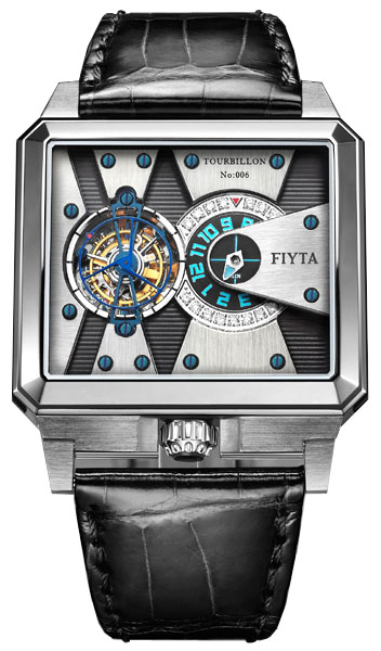 FIYTA Tourbillon Movement, Manual-winding Power Reservations 48 hours Stainless Steel Case Black hand-stitched Alligator Strap Sapphire Crystal 22 South Africa Diamonds, VVS Class Stainless Steel Bezel Double-pushed Solid Stainless Steel Buckle Blue Minute/Second Hand Skeleton & Sapphire Crystal Back Water resistant 50m Price $ 12,795