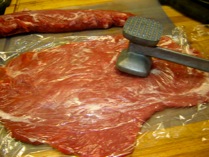 Before you start to pound the meat be sure to remove the “silver skin” that is present. Just take a knife (see picture) and cut off. Take off any residual fat pieces. Then start to pound out. If you leave the silver skin, the meat will be tough.