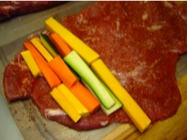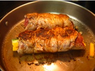 Once you have all the vegetables ready, salt and pepper the meat first then lay the vegetables on one end. Roll up the meat and tie with string or you can use toothpicks. I found that the string works better. This is not your ordinary string but it is specifically made for use in an oven and in cooking. I then sprinkled the outside with Adobe seasoning. I talked about Adobe seasoning in past postings. It is a Mexican seasoning that is delicious and full of flavor. I used this in place of salt on the outside. I then browned the meat on all sides in a stainless steel skillet.